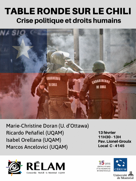 De retour d’une mission d’observation des droits humains, Marcos Ancelovici, titulaire de la Chaire de recherche en Sociologie des conflits sociaux, participe à une table ronde sur l’état des droits humains au Chili.